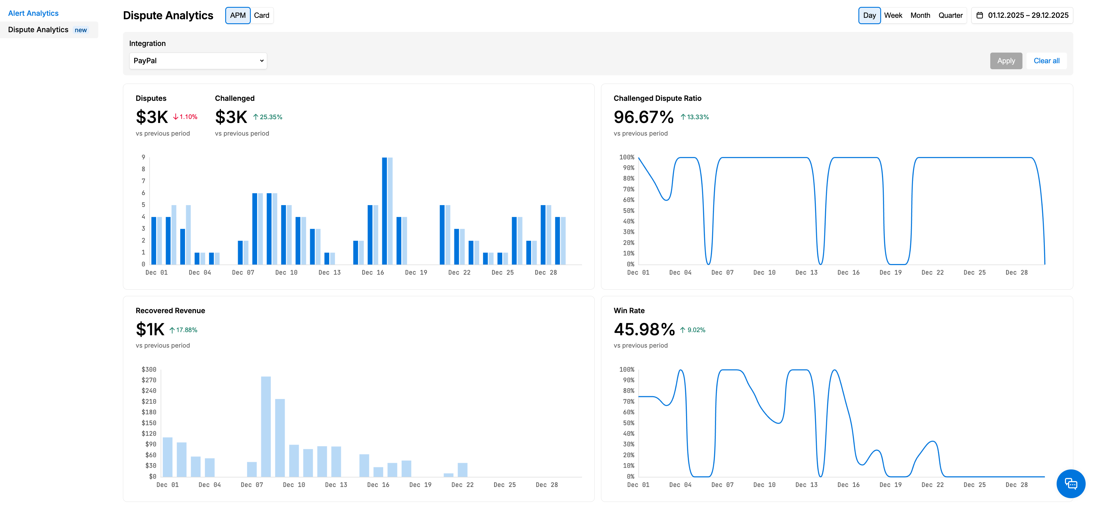 Recovered revenue Shows total wins or the amount returned to your business after successful dispute outcomes.