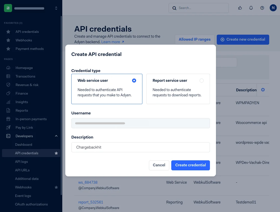 Generate API credentials to allow Chargebackhit to access your Adyen account.