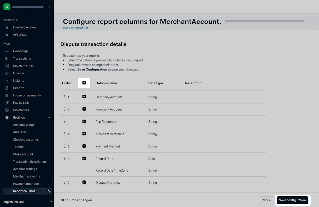 In the Adyen live Customer Area, go to Settings > Report columns.