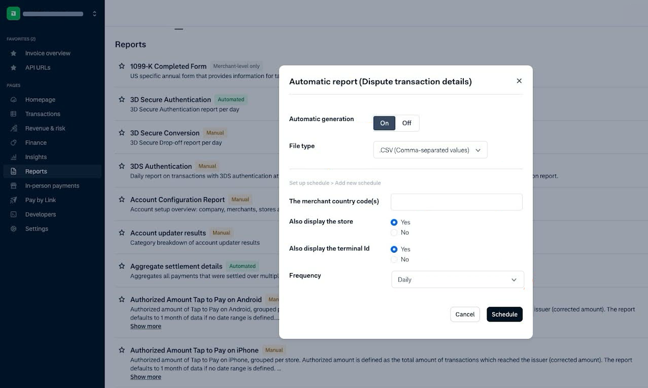 Set up automated reports to sync dispute information with Chargebackhit. This involves configuring the dispute report fields, enabling SFTP data transfer, and scheduling daily automated exports.